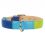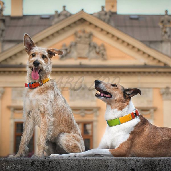 Atrakcyjna, dwuwarstwowa, obita obroża skórzana w kolorach tęczy, dla psów dużych ras. Szczegółowy opis