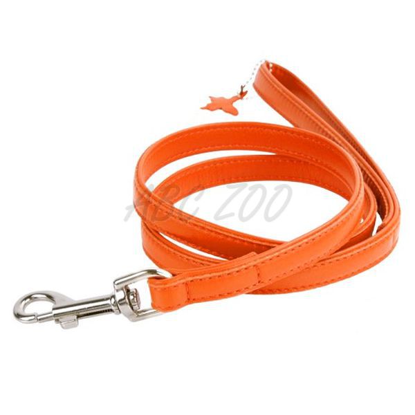Atrakcyjna, ręcznie szyta smycz skórzana, w kolorze pomarańczowym, przeznaczona dla piesków małych ras. Szczegółowy opis