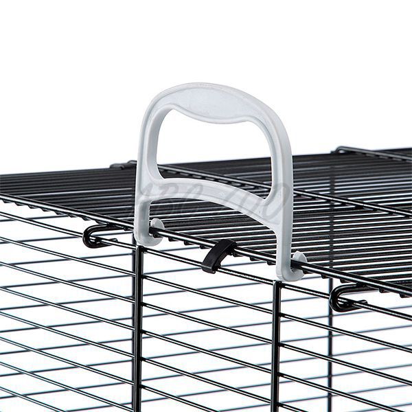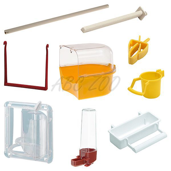 Klatka zawiera: 8x drążek, 2x karmnik, 2x poidełko, 2x metalowy uchwyt, stojak na kółkach