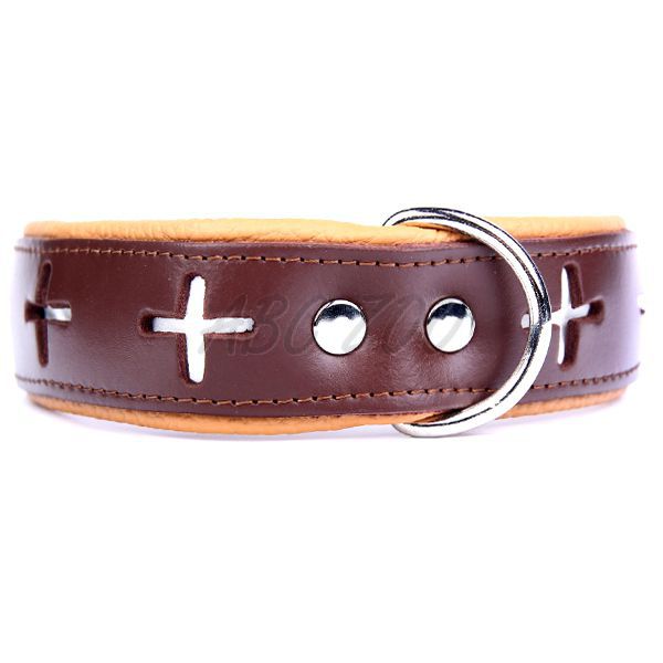 Obroża w kolorze brązowo - beżowym, wykonana ze skóry ozdobionej białymi krzyżykami. Szczegółowy opis