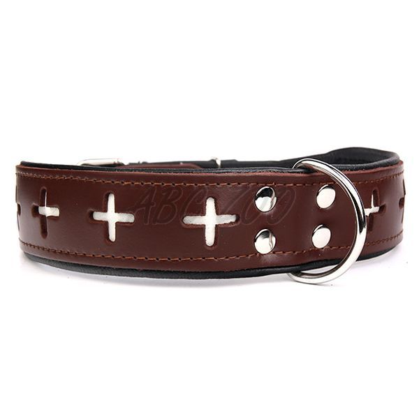 Obroża w kolorze brązowo - czarnym, wykonana ze skóry ozdobionej białymi krzyżykami. Szczegółowy opis