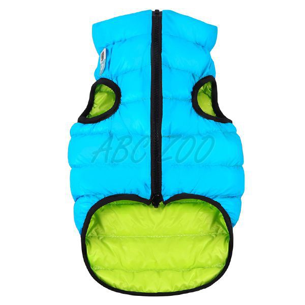 Bardzo lekka i ciepła, obustronna kamizelka w niebiesko-zielonym kolorze, dla małych psów z szeroką szyją i klatką piersiową. Szczegółowy opis