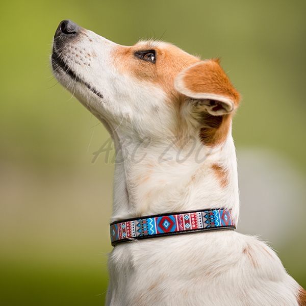 Skórzana obroża w czarnym kolorze z barwnym wzorem. Szczegółowy opis