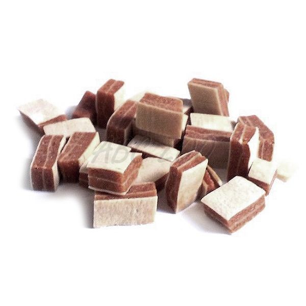 Uzupełniający pokarm dla psów i kotów w postaci kostek z mięsa z kaczki i dorsza. Szczegółowy opis