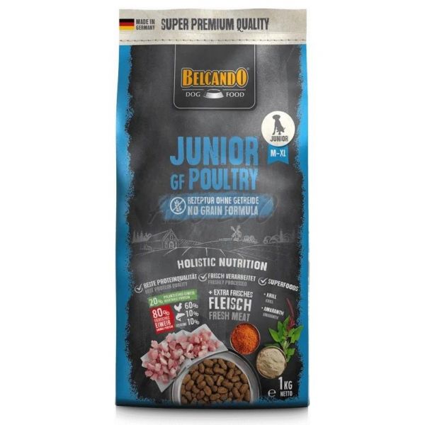 Kompletna, bezzbożowa karma dla młodych psów średnich i dużych ras cierpiących na nietolerancję glutenu lub zbóż. Szczegółowy opis