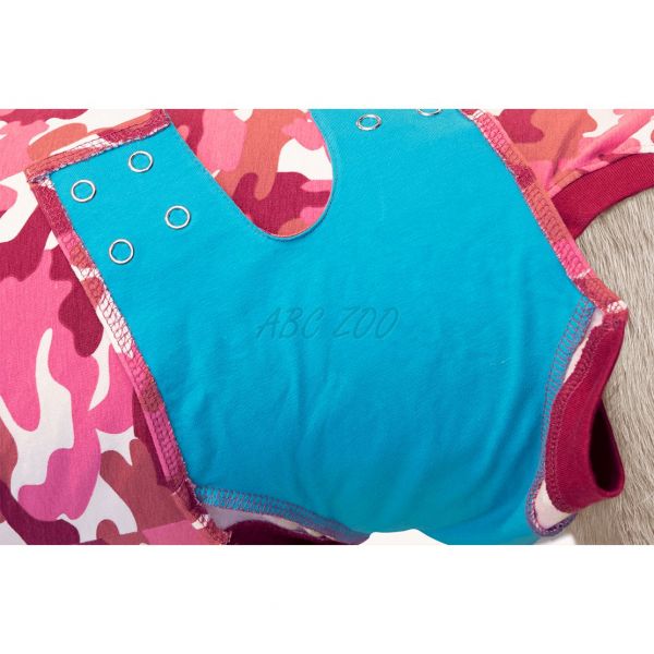 w wielu przypadkach obszar operacyjny dla psów znajduje się bardzo blisko miejsca oddawania moczu, ubrania są całkowicie zamknięte (bez względu na płeć), aby zapewnić ochronę całej okolicy - ale abyśmy mogli wyprowadzić psa lub sprawdzić ranę, ubranie można łatwo zwinąć i przymocować do klatki piersiowej za pomocą guzika
