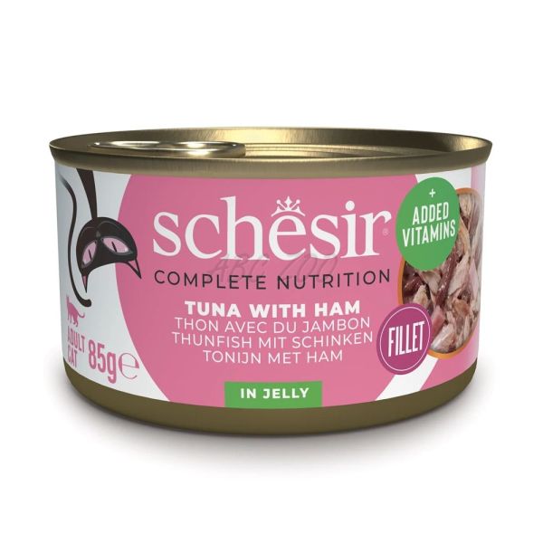 Schesir konserwa dla dorosłych kotów, z tuńczykiem i szynką w galarecie.