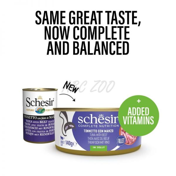 Schesir konserwa dla dorosłych kotów z tuńczykiem i wołowiną w galarecie.