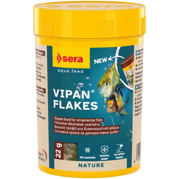 Kompletny pokarm w płatkach dla wszystkich ryb akwariowych, które żerują na powierzchni. Vipan Flakes oferuje zrównoważoną recepturę z naturalnymi składnikami i prebiotykami, które wspierają zdrowy wzrost, silny rozwój i witalność ryb. Płatki długo zachowują swój kształt i nie zanieczyszczają wody, co czyni je idealnymi również do akwariów towarzyskich.