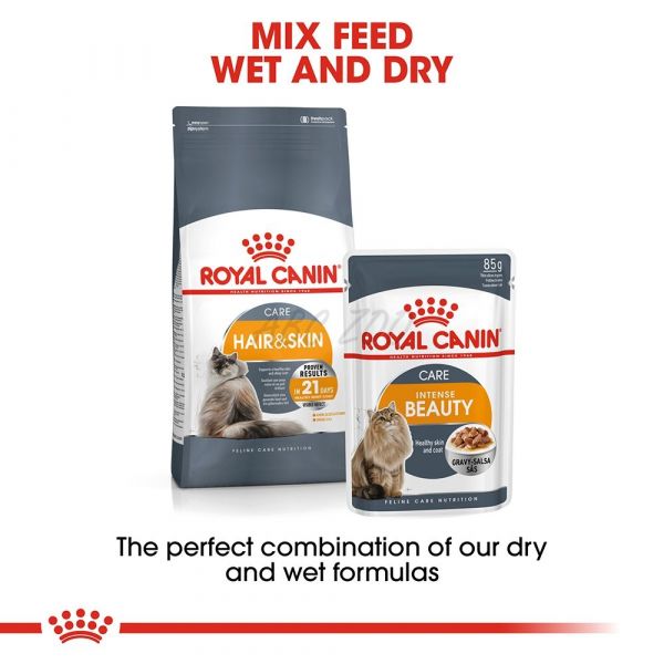ROYAL CANIN® Hair & Skin Care jest dostępny zarówno w galaretce, jak i w pasztecie, a także jako suche karmy. Mieszanka mokrego i suchego pokarmu zapewnia kotom różnorodność, którą uwielbiają.
