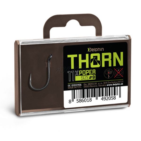 THORN Poper to specyficzny haczyk przez wygięte na zewnątrz oczko. Taka konstrukcja predestynuje go przede wszystkim do stosowania z przynętami typu pop-up. Doskonale nadaje się do tworzenia zestawów, takich jak Chod rig, Multi rig, Zig rig i tym podobne. Dzięki lekkiej wewnętrznej krzywiźnie idealnie wpasowuje się w pysk karpia po uderzeniu.