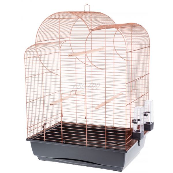 Elegancka klatka dla papug z pełnym wyposażeniem. Miedziana kratka, czarna taca. Szczegółowy opis