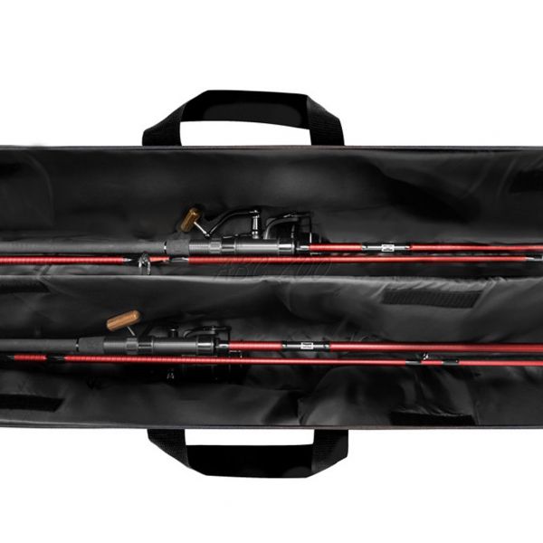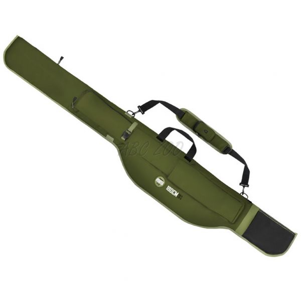 Pokrowiec jest zaprojektowane w kolorze zielonym z czarnymi dodatkami i jest wykonane z bardzo wytrzymałej tkaniny, która z łatwością zniesie lekki deszcz lub wilgoć spowodowaną rosą. W dolnej części znajduje się również wytrzymały, wodoodporny materiał, który pozwala na postawić go na mokrym podłożu.Pokrowiec jest w pełni wyściełany miękką wyściółką o grubości 6 mm na wszystkich ścianach, łącznie z przegrodą. Dzięki temu nie ma niebezpieczeństwa wzajemnego uszkodzenia 2 wędek podczas transportu. Obie wewnętrzne komory na wędki można przymocować za pomocą rzepu na górze.Dzięki przedłużonej części do przechowywania kołowrotków zmieszczą się wszystkie standardowe zestawy karpiowe, pomyśleliśmy również o wędziskach z przelotkami o średnicy 50 mm, na które w poszczególnych komorach jest wystarczająco dużo miejsca.Z boku pokrowca znajduje się długa kieszeń zapinana na zamek, która posłuży np. do transportu podbieraka. Ma jednak jeszcze jedną kieszeń z paskiem mocującym, dzięki czemu zapewnia większą przestrzeń i zmienność. Kolejna świetna cecha znajduje się na pasku na ramię, gdzie umieszczono małą kieszonkę, w której można przechowywać drobiazgi.Wysokiej jakości zamki błyskawiczne, wygodna rączki lub pasek na ramię są również częścią pokrowca.