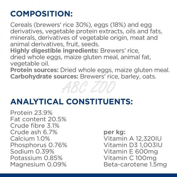 SKŁAD: zboża (ryż browarniczy 30%), jaja (18%) i produkty pochodne jaj, białkowe ekstrakty warzywne, oleje i tłuszcze, minerały, składniki pochodzenia roślinnego, mięso i składniki pochodzenia zwierzęcego, owoce, nasiona.