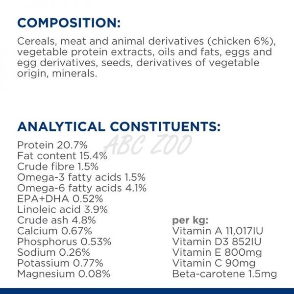 SKŁADNIKI: Zboża, mięso i produkty pochodzenia zwierzęcego (kurczak 6%), roślinne ekstrakty białkowe, oleje i tłuszcze, jaja i produkty jajeczne, nasiona, produkty uboczne pochodzenia roślinnego, minerały.SKŁAD ANALITYCZNY: Białko 20,7%, Zawartość tłuszczów 15,4%, Włókno gruboziarniste 1,5%, Kwasy tłuszczowe Omega-3 1,5%, Kwasy tłuszczowe Omega-6 4,1%, EPA+DHA 0,52%, Kwas linolowy 3,9%, Popiół 4,8%, Wapń 0,67%, Fosfor 0,53%, Sód 0,26%, Potas 0,77%, Magnez 0,08%; Na kg: witamina A 11,017IU, witamina D3 852IU, witamina E 800mg, witamina C 90mg, beta-karoten 1,5mg.DODATKI NA 1 KG: Dodatek odżywczy: 3b103 (żelazo) 76,3 mg, 3b202 (jod) 1,9 mg, 3b405 (miedź) 7,5 mg, 3b502 (mangan) 7,9 mg, 3b603 (cynk) 134 mg, 3b801 (selen) 0,2 mg, z naturalnym przeciwutleniaczem.