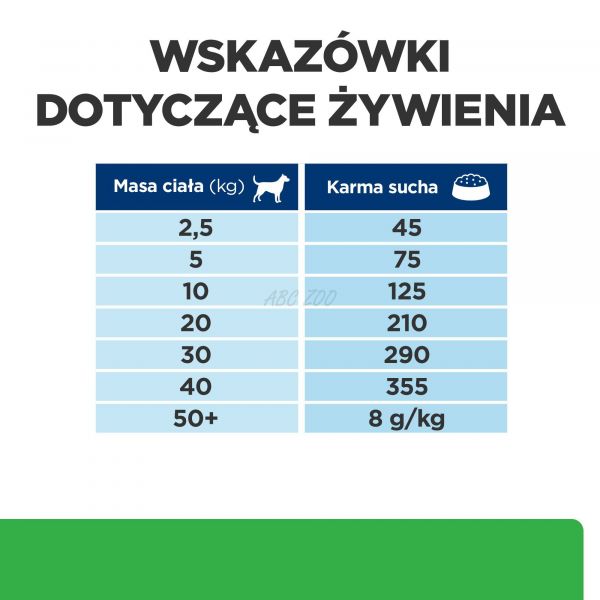 Podawaj wyłącznie zalecaną Prescription Diet. Przed użyciem poproś weterynarza o szczegółowe instrukcje dotyczące karmienia zwierzęcia. Pełne informacje na temat karmienia można znaleźć na opakowaniu. Zalecane dawki dzienne są jedynie wartościami orientacyjnymi, na których należy oprzeć dawkę. Jeśli nie masz pewności, skonsultuj się z weterynarzem. Zapewnij stały dostęp do świeżej wody.Czy to pierwszy raz, kiedy podajesz tą karmę? Wymieszaj stopniowo zwiększającą się proporcję nowej karmy ze zmniejszającą się proporcją obecnej karmy w ciągu 7 dni. Woda musi być zawsze dostępna! Z wiekiem potrzeby żywieniowe twojego zwierzęcia mogą się zmienić. Zawsze skonsultuj tą sprawę z weterynarzem podczas kontroli lekarskiej.