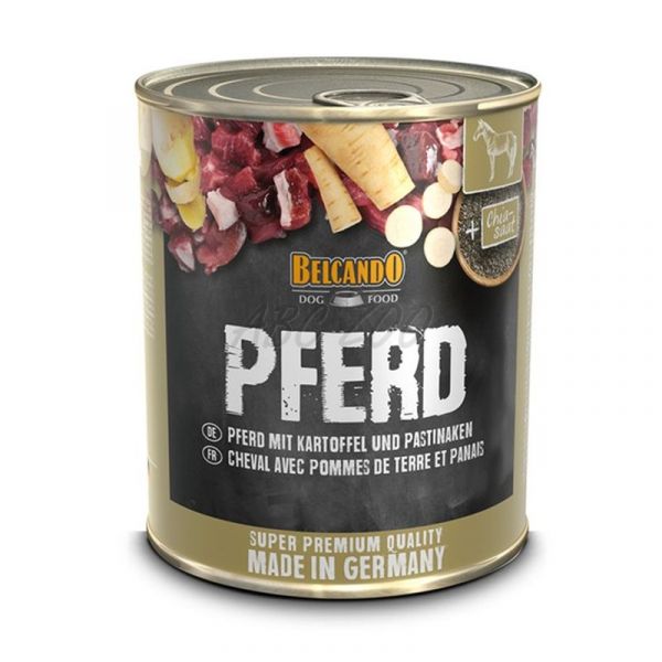 Składniki: mięso końskie, serce, żołądek, wątroba, płuca (63%), bulion mięsny 28,5%, ziemniaki 4%, pasternak 2%, nasiona chia 1%, olej z krokosza 0,5%, skorupki jaj suszone 0,5%, minerały 0,5%Składniki analityczne: białko 11%, tłuszcz 5,5%, popiół 2%, błonnik 0,4%, wilgotność 79%