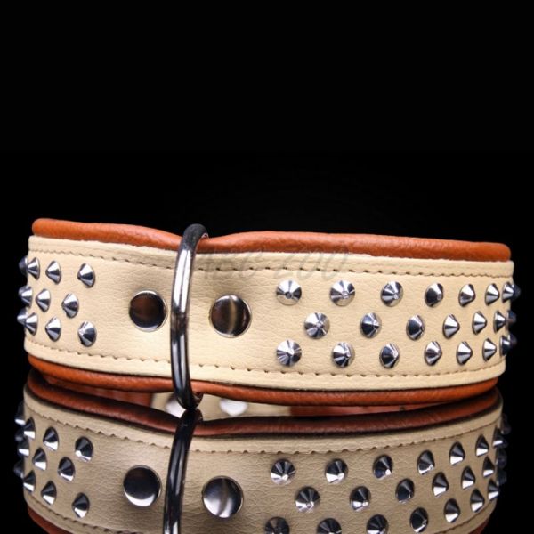 Brązowy - beżowy kołnierz ozdobiony metalowymi kolcami. Szczegółowy opis