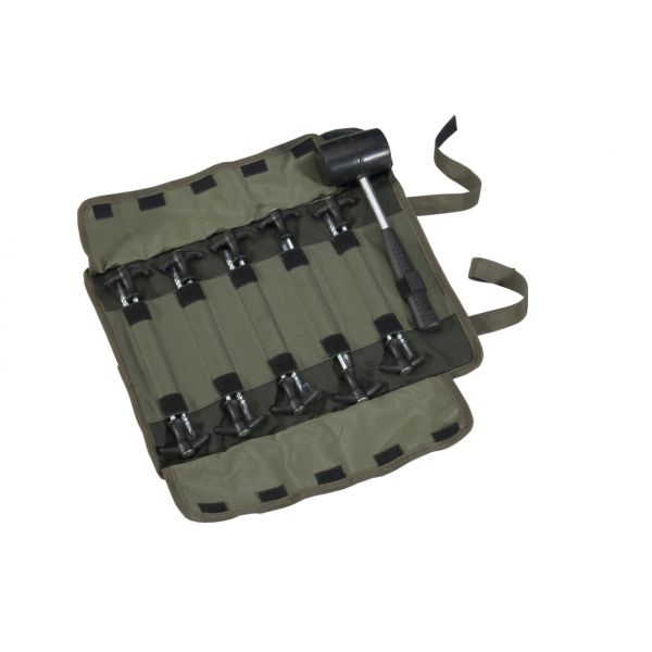 Zestaw zapasowych kołków do biwaku w poręcznym zestawie z gumowanym młotkiem. Kołki są poddane specjalnej obróbce i wzmocnione metalowym wierzchołkiem, w który można uderzać z całej siły bez ryzyka uszkodzenia. Gwinty na kołkach pomagają lepiej wbić się w ziemię i jednocześnie utrzymać w niej. Zestaw dostarczany jest w poręcznej, wytrzymałej walizce.