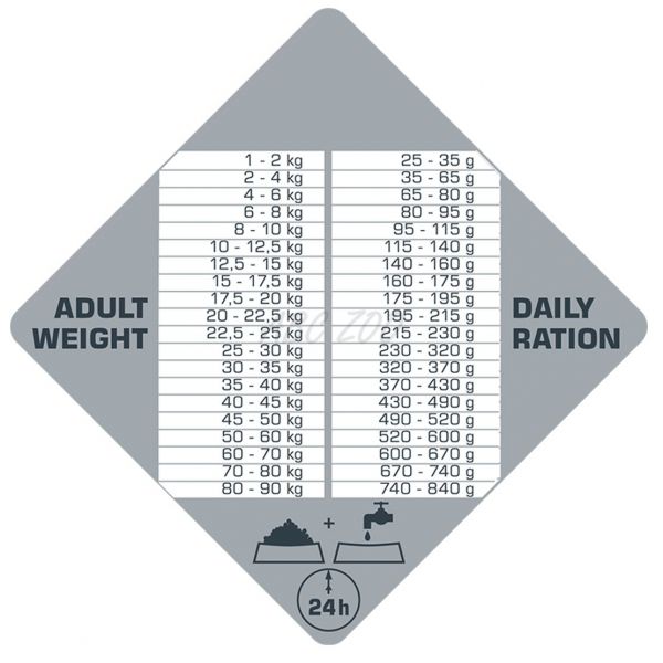 Składniki analityczne: białko 38% (*82% białko zwierzęce z zawartości białka ogólnego), zawartość tłuszczu 18%, popiół gruboziarnisty 8,5%, błonnik 3,5%, wapń 1,3%, fosfor 0,9%, tauryna 2300 mg/kg