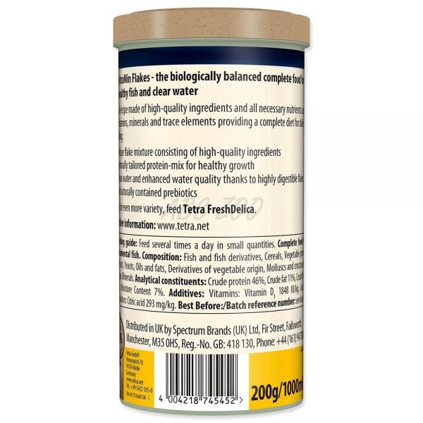 Analiza jakościowa: witamina A 37600 IU/ kg, witamina D3 2000 IU/ kg, witamina E 125 mg / kg, witamina B1 45 mg / kg, witamina B2 125 mg / kg, witamina B6 25 mg / kg, witamina B12 0,1 mg / kg, L-askorbil-2-polifosfat (stabilizowana witamina C) 515 mg / kg, pantotenian wapnia 125 mg / kg. Pokarm produkowany jest również w wersji Tetra Min, Tetra Min mini i Tetra Min duże płatki.