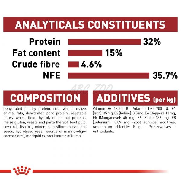 Składniki: kukurydza, suszona mięso drobiowe, ryż, glutena kukurydziana, hydrolizowane białko wieprzowe, tłuszcze pochodzenia zwierzęcego, zboże, mąka, hydrolizowane białko pochodzenia zwierzęcego, włókno roślinne, pulpa buraczana, drożdże, substancje mineralne, olej rybny, olej sojowy, proszek jajeczny, hydrolizowane drożdże (mannan-oligosacharydy), wyciąg z nagietek (źródło luteiny)