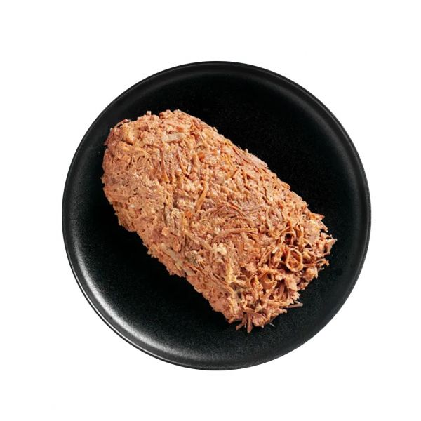 Składniki: kurczak, wątróbka, serce, żołądek (40%), bulion mięsny (33,8%), szarpana wołowina (14%), płuca wołowe (11%), skorupki jaj, suszone (0,5%), minerały (0,5%), łosoś olej (0,2%)