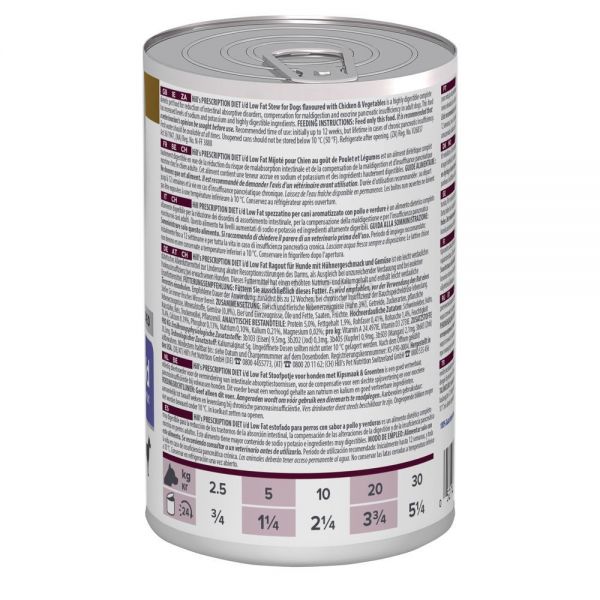 Gulasz dla psów Hill's PRESCRIPTION DIET i/d Low Fat o smaku kurczaka i warzyw to wysoce strawna i kompletna dietetyczna karma przeznaczona do ograniczania objawów zaburzeń wchłaniania jelitowego oraz do kompensacji skutków złego trawienia i zewnątrzwydzielniczej niewydolności trzustki u dorosłych psów. Ta dietetyczna karma zawiera zwiększone ilości sodu i potasu oraz wysoce strawne składniki.