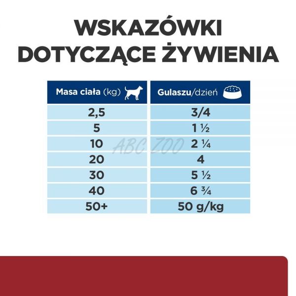 Poproś lekarza weterynarii o szczegółowe instrukcje dotyczące karmienia Twojego zwierzęcia. Pełne instrukcje dotyczące karmienia znajdują się na opakowaniu. Codzienne zalecenia żywieniowe to tylko wskazówka i miejsce, od którego można zacząć. Gramy są najdokładniejszą formą pomiaru; kubki szacowane są od gramów. Wprowadzaj nową karmę dla swojego zwierzęcia stopniowo, przez okres 7 dniu lub zgodnie z zaleceniami lekarza weterynarii. Zapewnij stały dostęp do świeżej wody! Potrzeby żywieniowe Twojego zwierzęcia mogą się zmieniać wraz z wiekiem. Zapytaj swojego lekarza weterynarii przy każdej kontroli.