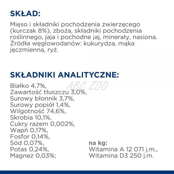SKŁAD: Mięso i składniki pochodzenia zwierzęcego (kurczak 8%), zboża, składniki pochodzenia roślinnego, jaja i pochodne jaj, minerały, nasiona. Źródła węglowodanów: kukurydza, mąka jęczmienna, ryż.