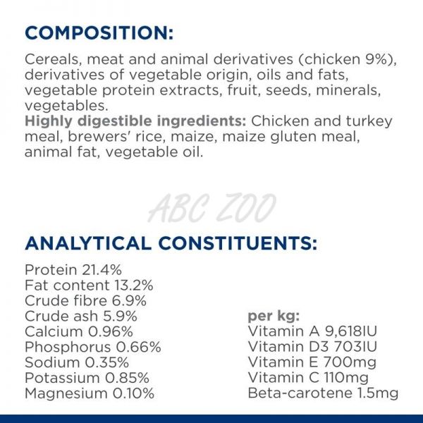 SKŁAD: zboża, mięso i składniki pochodzenia zwierzęcego (kurczak 9%), składniki pochodzenia roślinnego, oleje i tłuszcze, roślinne ekstrakty białkowe, owoce, nasiona, minerały, warzywa. Wysoce lekkostrawne składniki: mączka z kurczaka i indyka, ryż browarniczy, kukurydza, glutenowa mączka kukurydziana, tłuszcz zwierzęcy, olej roślinny.