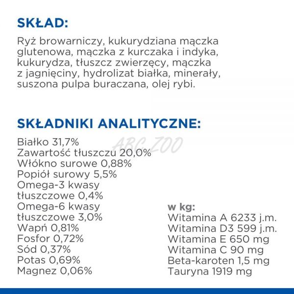 SKŁAD: Ryż browarniczy, kukurydziana mączka glutenowa, mączka z kurczaka i indyka, kukurydza, tłuszcz zwierzęcy, mączka z jagnięciny, hydrolizat białka, minerały, suszona pulpa buraczana, olej rybi.