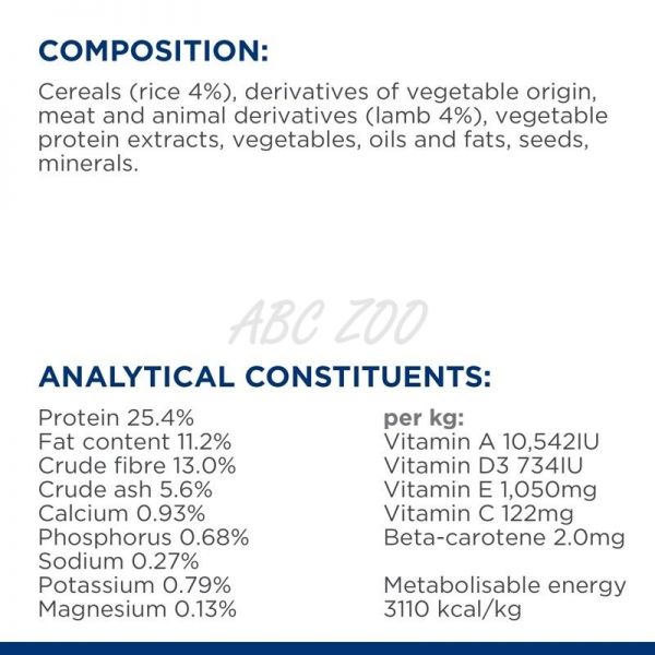 SKŁAD: zboża (ryż 4%), składniki pochodzenia roślinnego, mięso i składniki pochodzenia zwierzęcego (jagnięcina 4%), roślinne ekstrakty białkowe, warzywa, oleje i tłuszcze, nasiona, minerały.