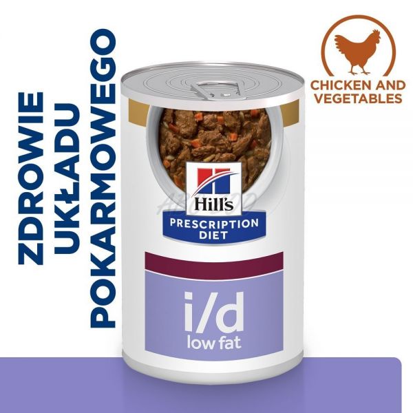 Gulasz dla psów Hill's PRESCRIPTION DIET i/d Low Fat o smaku kurczaka i warzyw to wysoce strawna i kompletna dietetyczna karma przeznaczona do ograniczania objawów zaburzeń wchłaniania jelitowego oraz do kompensacji skutków złego trawienia i zewnątrzwydzielniczej niewydolności trzustki u dorosłych psów. Ta dietetyczna karma zawiera zwiększone ilości sodu i potasu oraz wysoce strawne składniki.