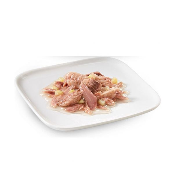 Składniki: makrela 40%, tuńczyk 20%, bataty 4%, ryż 1,5%, skrobia ziemniaczana 1,1%, bulion rybny 0,3%Składniki analityczne: substancje azotowe 12,7%, tłuszcz 0,5%, błonnik 0,5%, popiół 1,5%, wilgotność 83%