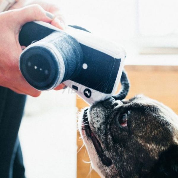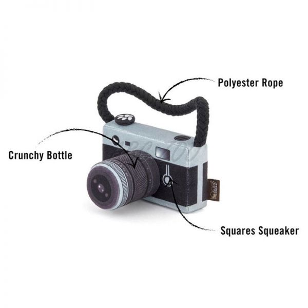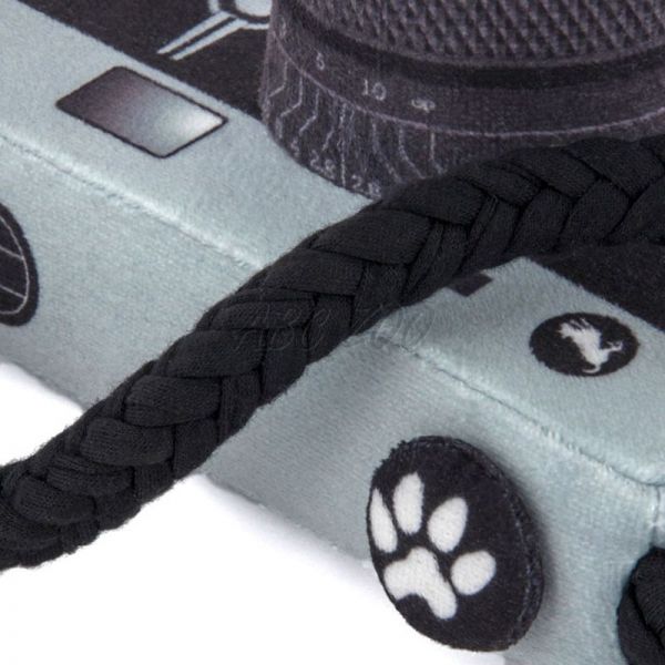 Funkcjonalna zabawka pluszowa dla psów w kształcie aparatu fotograficznego. Szczegółowy opis
