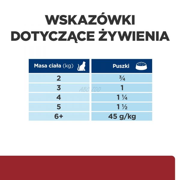 Poprosić lekarza weterynarii o szczegółowe instrukcje dotyczące żywienia zwierzęcia. Pełne instrukcje dotyczące żywienia znajdują się na opakowaniu. Zalecenia dotyczące dziennego żywienia są jedynie wskazówką i miejscem, w którym należy zacząć. Gramy są najdokładniejszą formą pomiaru. Czy podajesz tę karmę po raz pierwszy? Proszę mieszać coraz większe ilości nowej karmy z coraz mniejszymi ilościami starej karmy przez 7 dni lub dłużej. Świeża woda musi być zawsze dostępna! Potrzeby żywieniowe zwierzęcia mogą się zmieniać wraz z wiekiem. Proszę zapytać o to lekarza weterynarii podczas każdej wizyty kontrolnej.