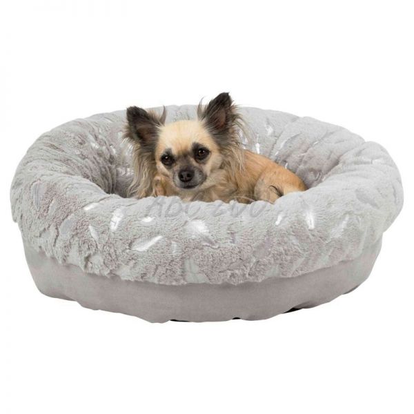 Miękkie legowisko wykonane z zamszu i pluszu z motywem piór. Szczegółowy opis