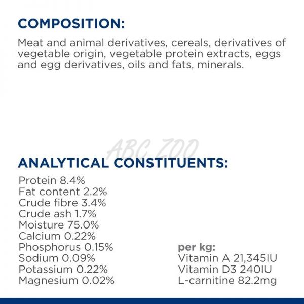 COMPOSITION: Meat and animal derivatives, cereals, derivatives of vegetable origin, vegetable protein extracts, eggs and egg derivatives, oils and fats, minerals.