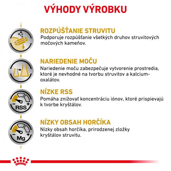 Specjalna dieta weterynaryjna dla dorosłych kotów cierpiących na choroby układu moczowego. Choroby układu moczowego u kotów mogą prowadzić do powstawania kamieni moczowych, w tym kamieni struwitowych lub szczawianu wapnia. Veterinary Diet for Proper Bladder, Urinary Tube and Kidney Function została opracowana, aby pomóc w rozpuszczaniu kamieni moczowych, produkcji nienasyconego moczu i zapobieganiu nawrotom.