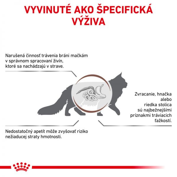 Dieta weterynaryjna odbudowująca przewód pokarmowy kotów jest odpowiednia w przypadku ostrej i przewlekłej biegunki, zapalenia żołądka, zapalenia okrężnicy, przerostu bakteryjnego jelita cienkiego lub dysoreksji. W zaburzeniach żołądkowo-jelitowych konieczne jest zmniejszenie ryzyka choroby poprzez wchłanianie składników odżywczych w jelicie i wspomaganie regeneracji ściany jelita za pomocą odpowiedniej diety.
