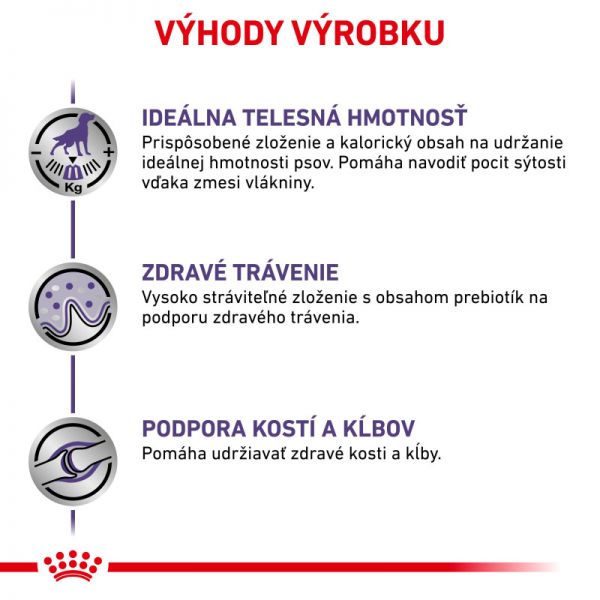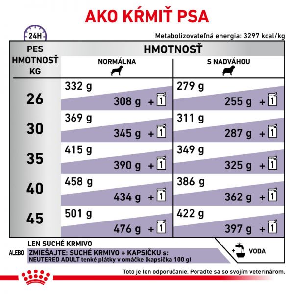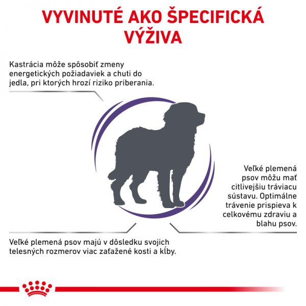 ZALECANE STOSOWANIE W PRZYPADKACH:-Dorosłe wykastrowane psy dużych ras (>25kg) w wieku 15 miesięcy i starsze- Skłonność do tycia lub wrażliwość na kolanaNIE ZALECANE W PRZYPADKACH:- Wzrost, ciąża/laktacjaJako część gamy produktów weterynaryjnych ROYAL CANIN®, ważne jest, aby ten produkt był podawany zwierzęciu wyłącznie zgodnie z zaleceniami lekarza weterynarii. Przejście Państwa zwierzęcia z jednej diety na drugą powinno być płynnym i stopniowym procesem trwającym 7-10 dni. Proszę pamiętać o przestrzeganiu prawidłowych ilości, zwłaszcza w przypadku karmienia mieszanego.