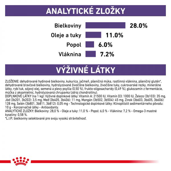 SKŁADNIKI ANALITYCZNE: Białko: 28,0% - Oleje i tłuszcze: 11,0% - Popiół: 6,0% - Błonnik: 7,2% - Kwasy tłuszczowe omega-3: 0,58% - EPA/DHA: 0,3% - Niezbędny kwas tłuszczowy (kwas linolowy): 2,2%.