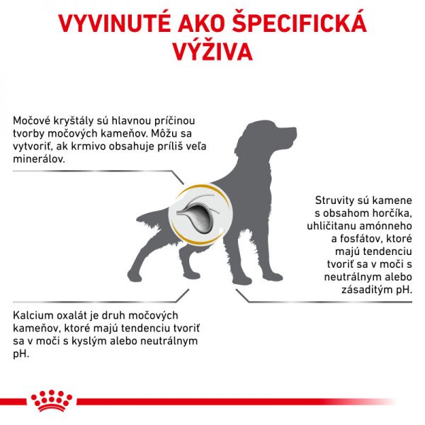 Specjalna dieta weterynaryjna dla dorosłych psów cierpiących na choroby układu moczowego.Choroby układu moczowego u psów mogą prowadzić do bakteryjnego zapalenia pęcherza moczowego i powstawania kamieni moczowych, w tym kamieni struwitowych lub szczawianu wapnia. Dieta weterynaryjna zapewniająca prawidłowe funkcjonowanie pęcherza moczowego i cewki moczowej ma na celu pomoc w rozpuszczaniu kamieni moczowych, wspomaganie leczenia zapalenia pęcherza moczowego i zapobieganie nawrotom.