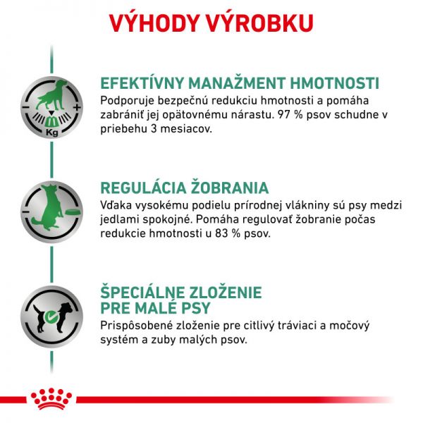 ZALETY PRODUKTUEFEKTYWNE ZARZĄDZANIE WAGĄWspomaga bezpieczną redukcję masy ciała i pomaga zapobiegać ponownemu przybieraniu na wadze. 97% psów traci na wadze w ciągu 3 miesięcy.REGULACJA ŻYWIENIADzięki wysokiej zawartości naturalnego włókna, psy są najedzone między posiłkami. Pomaga regulować żebranie podczas redukcji masy ciała u 83% psów.SPECJALNY SKŁAD DLA MAŁYCH PSÓWDostosowana formuła dla wrażliwego układu pokarmowego i moczowego oraz zębów małych psów.