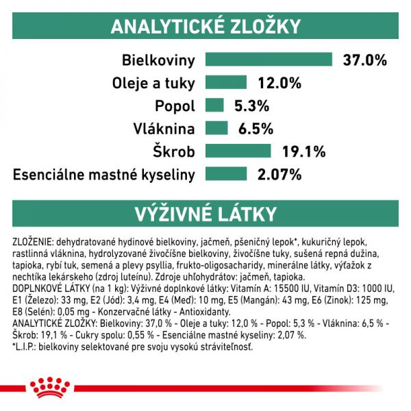 Skład: odwodnione białko drobiowe, jęczmień, hydrolizowane białko zwierzęce, gluten pszenny*, gluten kukurydziany, włókno roślinne, tłuszcze zwierzęce, chipsy z trzciny cukrowej, maniok (tapioka), olej rybny, nasiona i łuski psyllium, fruktooligosacharydy, sole mineralne, mączka z aksamitki wzniesionej. Źródła glicydów: jęczmień (20,5%), maniok (tapioka) (5%).