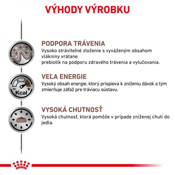 ZALETY PRODUKTU WSPARCIE TRAWIENIA Wysoko strawna kompozycja z wyważoną zawartością błonnika, w tym prebiotyków, wspierających zdrowe trawienie i wydalanie. DUŻO ENERGII Wysoka zawartość energii, która przyczynia się do zmniejszenia dawek, a tym samym łagodzi obciążenie układu pokarmowego. WYSOKA SMAKOWITOŚĆ Wysoka smakowitość, która pomoże w przypadku obniżonego apetytu.