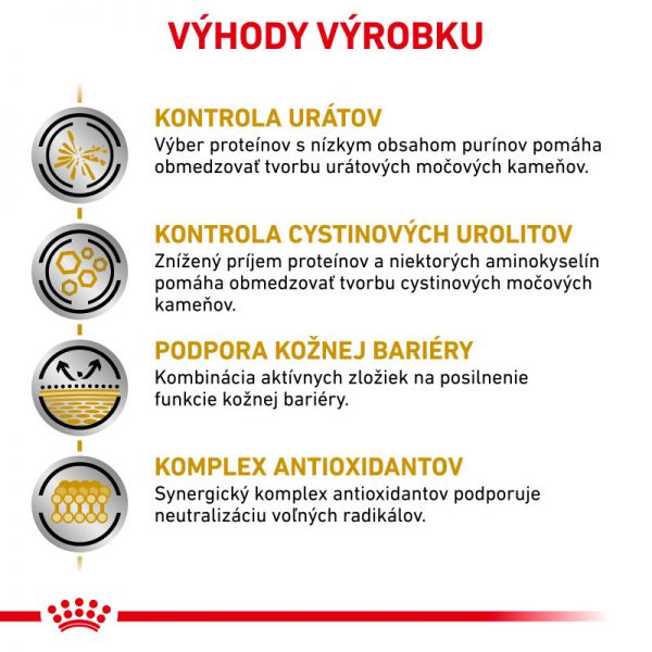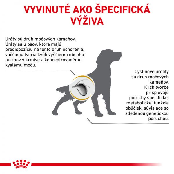 Specjalna dieta weterynaryjna dla dorosłych psów cierpiących na zwiększone tworzenie się kamieni moczowych. Niektóre psy mogą cierpieć na zaburzenia metaboliczne w wydalaniu kwasu moczowego i w konsekwencji zwiększone tworzenie się kamieni moczowych.